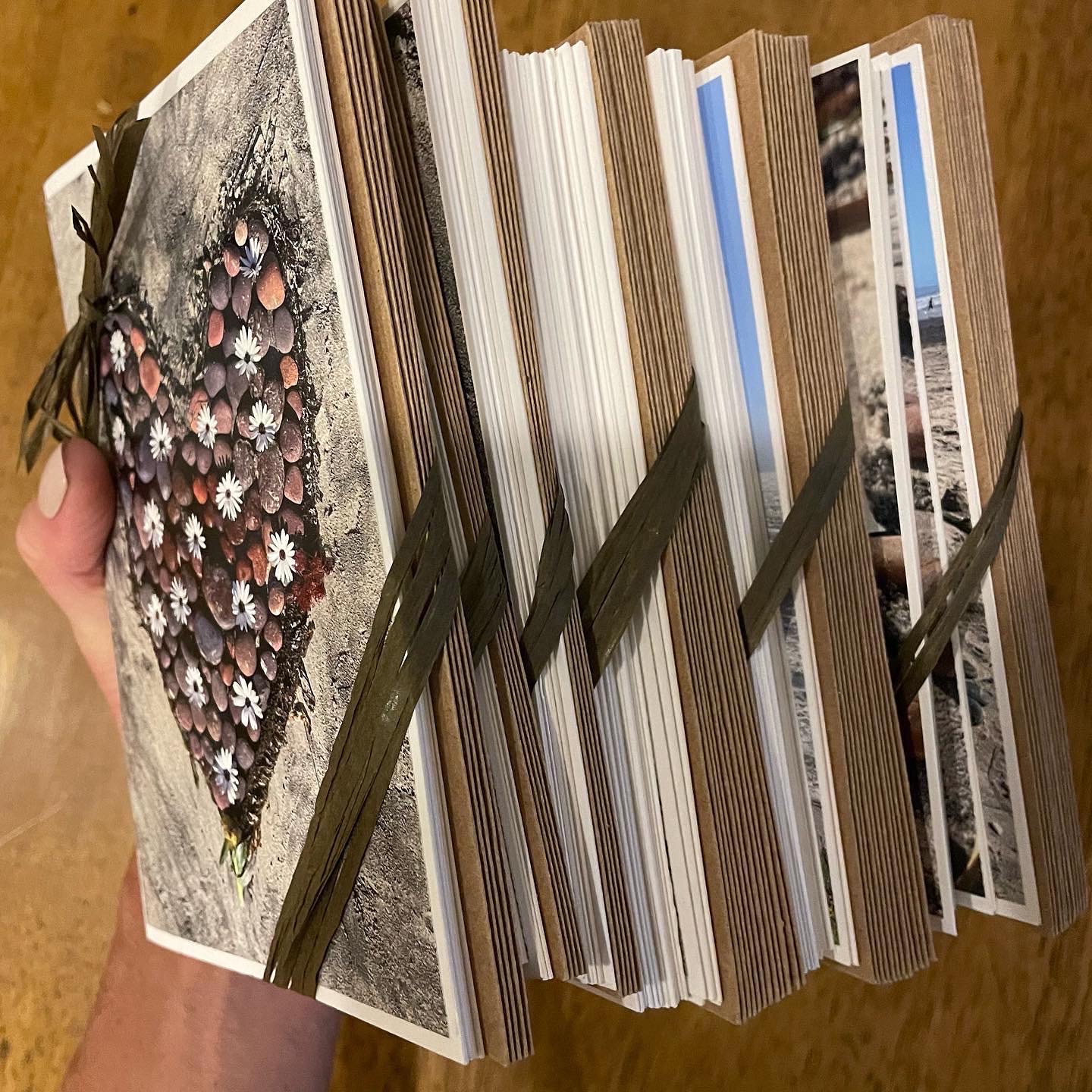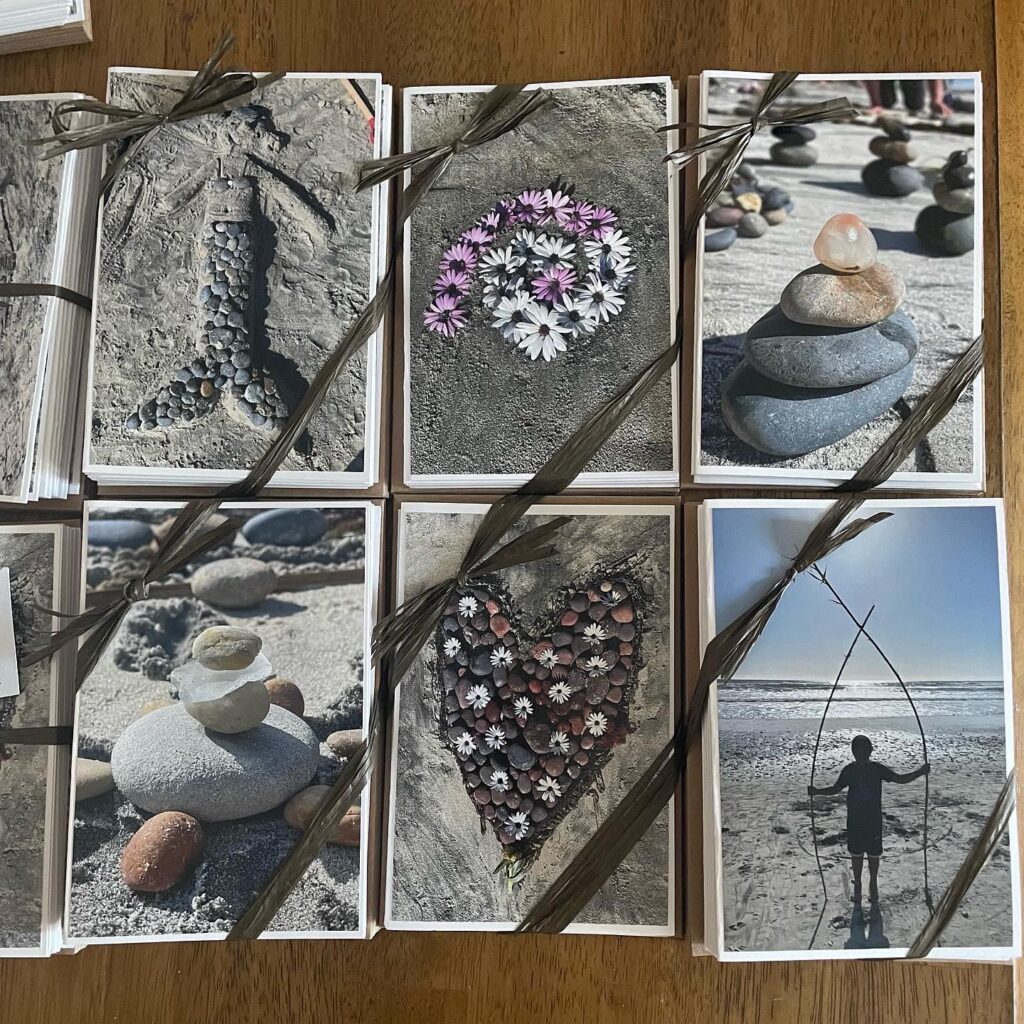 Update: We had a wonderful time making art together on the beach, using stones, seaweed, flowers, sticks, and other plant materials. Afterwards, my mom and I made cards to gift to everyone who came. “We’ll just make a few blank cards with the photos. It’ll be easy.” 6 hours later. We made 135 cards in total. Each one trimmed. Each card folded from good quality art paper. Very happy with these!